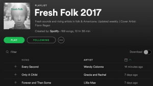 SPotify Fresh Folk wendy2017-04-24T15:31:12-05:00April 24th, 2017| Share This Story, Choose Your Platform! FacebookXRedditLinkedInTumblrPinterestVkEmail Leave A CommentYou must be logged in to post a comment.